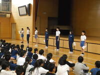 4月28日(月)の朝行事の時間に初めての児童集会が行われました。児童会本部の人が率先して皆を整列させたり司会進行をしてくれたりしました。この日は、各委員会の委員長または代表の人が前に並び、それぞれ本年度の委員会の目標や活動内容、皆へのお願いなどを堂々と発表してくれました。