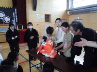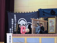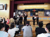 5月23日(金)の5・6校時に町内の下牧人形芝居保存会吉田座の皆さんによる伝統芸能体験を実施しました。人形浄瑠璃や人形の操作についての説明の後、実物の人形を用いて1体につき3人で動かす操り方を体験させていただきました。子供たちは人形の重さや3人が息を合わせて人形に演技をさせる難しさなどを実感していました。その後、吉田座の皆さんによる演目「傾城阿波の鳴門 順礼歌の段」を鑑賞しました。県指定文化財になっている地域の伝統芸能に触れて、町の魅力を再認識することができました。